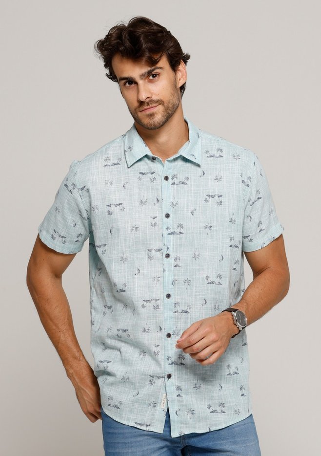 O Camisão VLCS Paraíso é a escolha ideal para quem deseja levar a leveza do verão e das praias para o seu look casual. Seu design é marcado pela estampa tropical delicada, com microdesenhos de coqueiros e veleiros que criam um visual temático sem ser exagerado. A gola tradicional e a manga curta são clássicas, mas a modelagem solta garante a modernidade e o conforto essenciais para os dias quentes. Os botões em tom de madeira complementam o visual natural da peça, tornando-a perfeita para combinar com bermudas de sarja ou calças claras.
