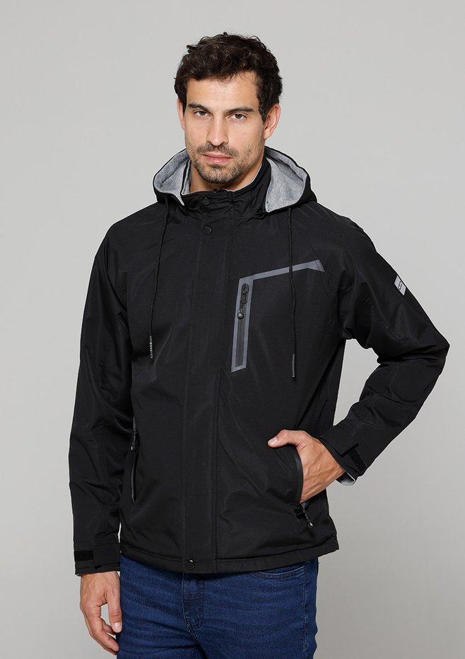 O visual preto moderno se destaca pelos acabamentos premium, como bolsos laterais com zíper, um bolso no peito com detalhe refletivo e capuz removível. Botões e puxadores personalizados VLCS reforçam a identidade da marca.